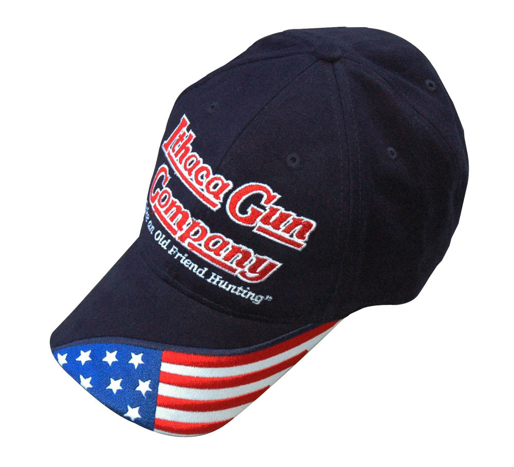 Made in the USA, 6 panel, navy, embroidered flag on the bill with red and white classic Ithaca logo and a Velcro adjustable strap.