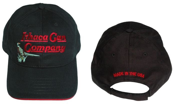 American made Black Hat, 6 panel, embroidered classic Ithaca Gun logo with pheasant and an adjustable velcro backstrap.