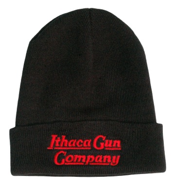 American made black cuffed knit cap with a red embroidered classic Ithaca Gun logo.