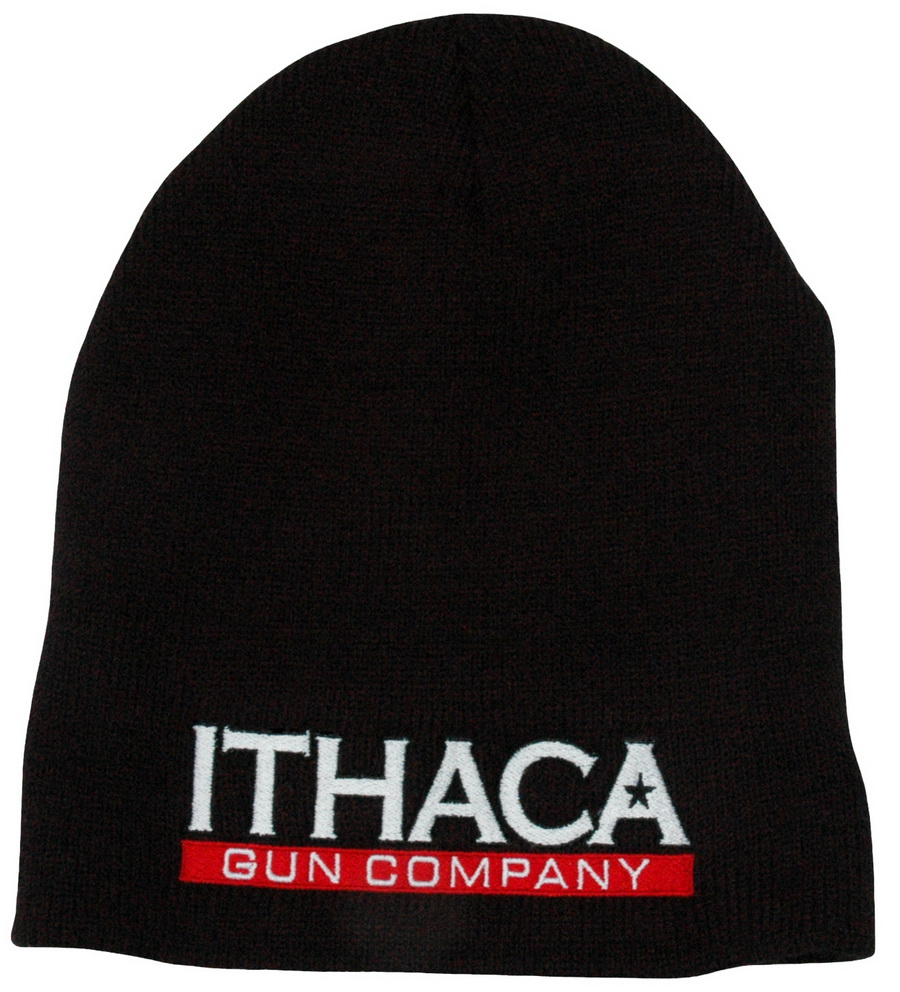 American made Black Knit Beanie Cap with Modern Ithaca Gun Logo.