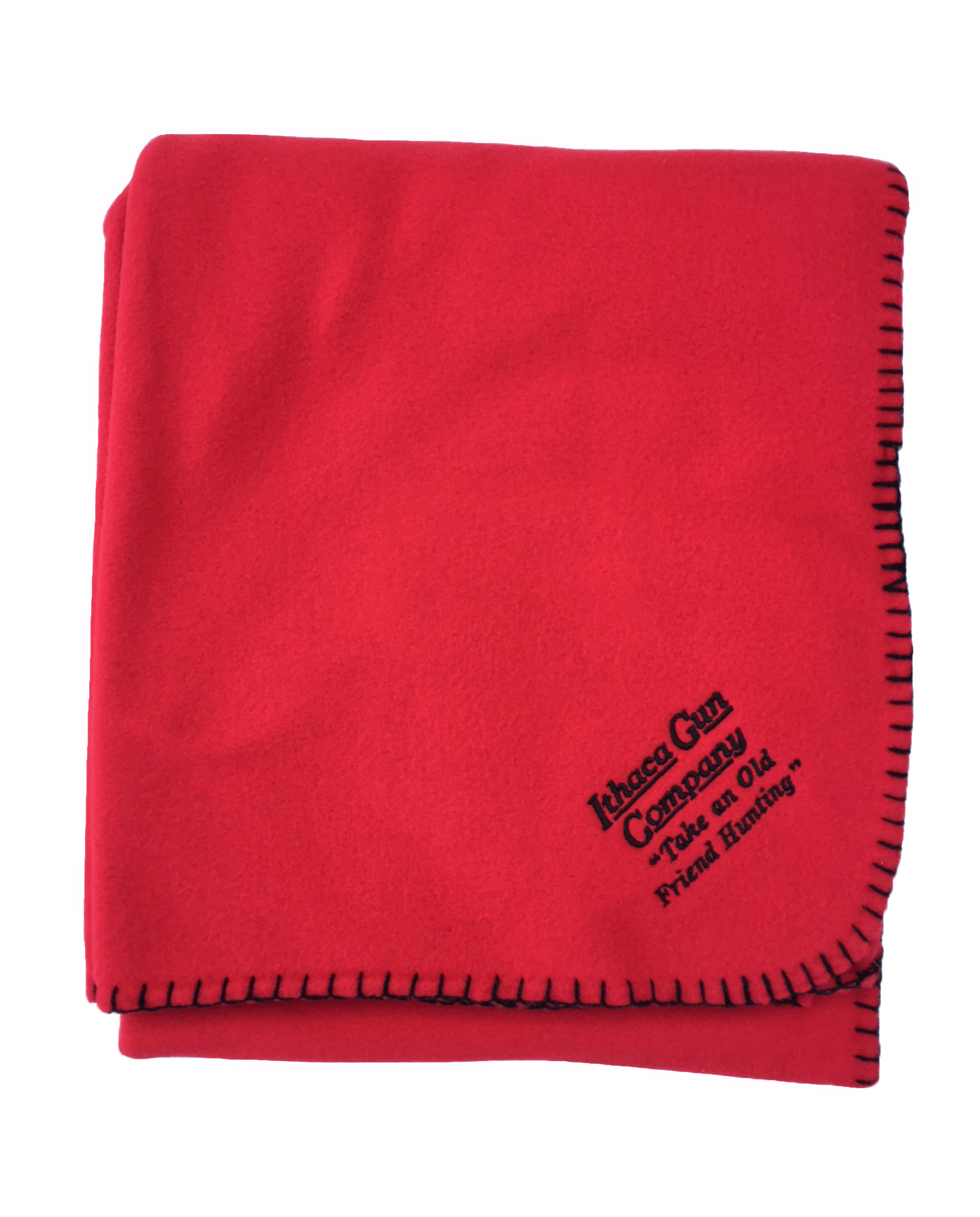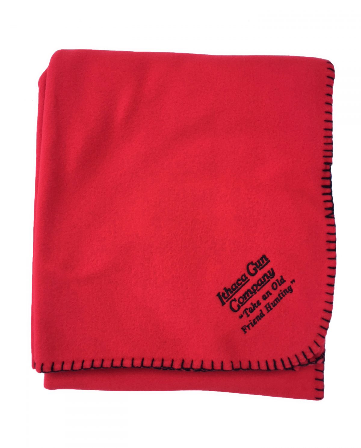 Red Fleece Stadium Blanket with black stitching outlining the edges and Ithaca Logo in the corner.