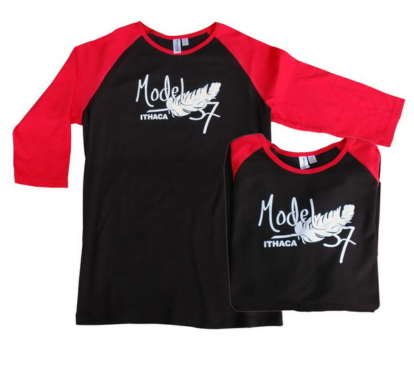 Ladies Junior Fitted T-Shirt, Black with Red 3/4″ Sleeves with Ithaca Model 37 Feather Graphic.