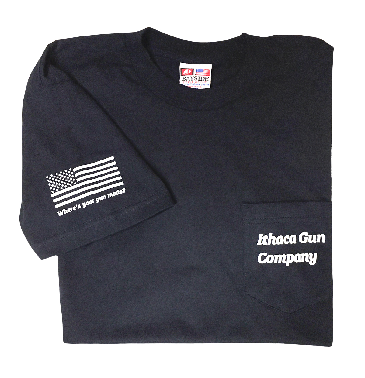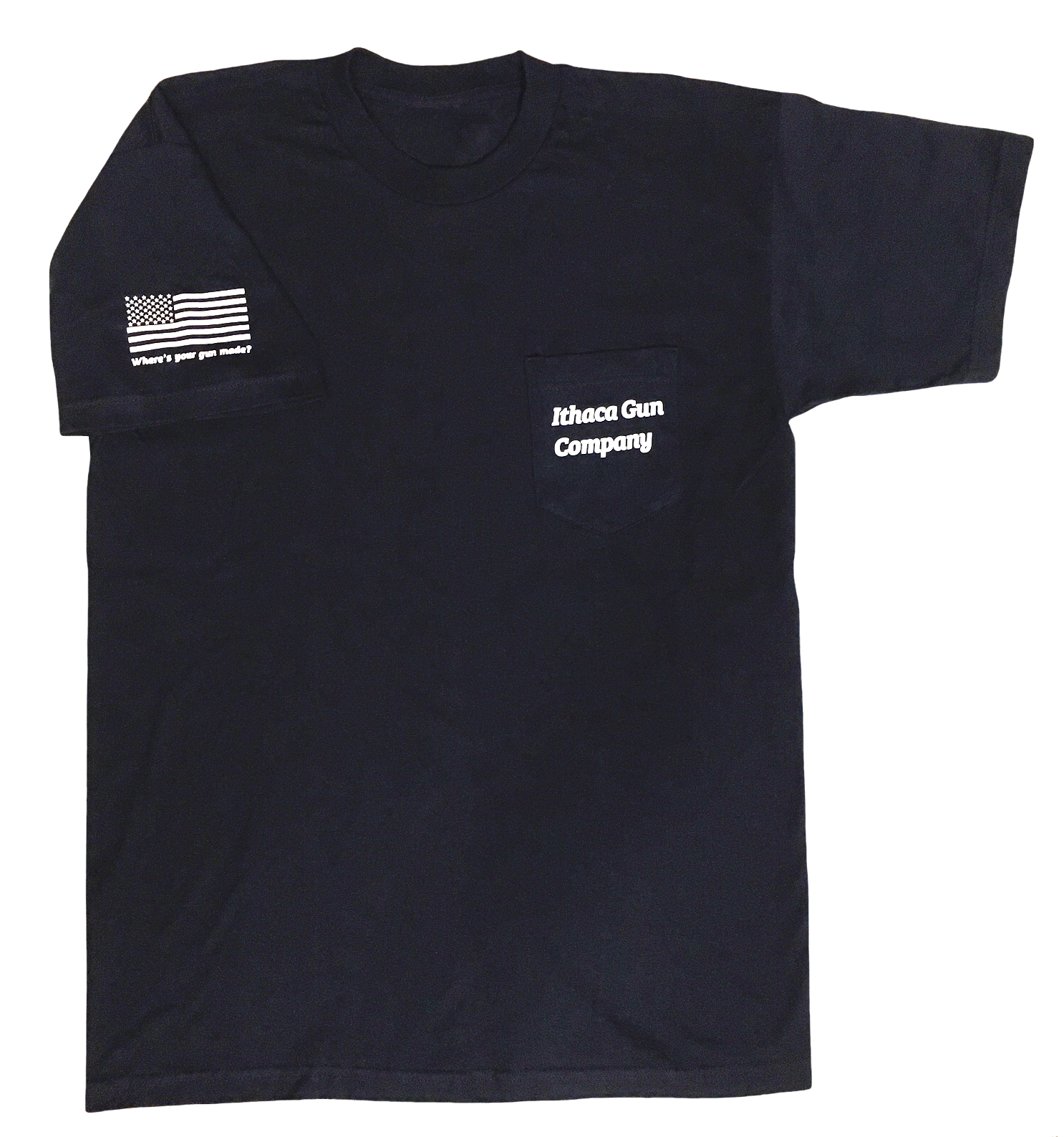 100% Cotton, Short Sleeve T-Shirt with Pocket, American Made with Ithaca Gun Company Logo on the Pocket, with American Flag on Sleeve