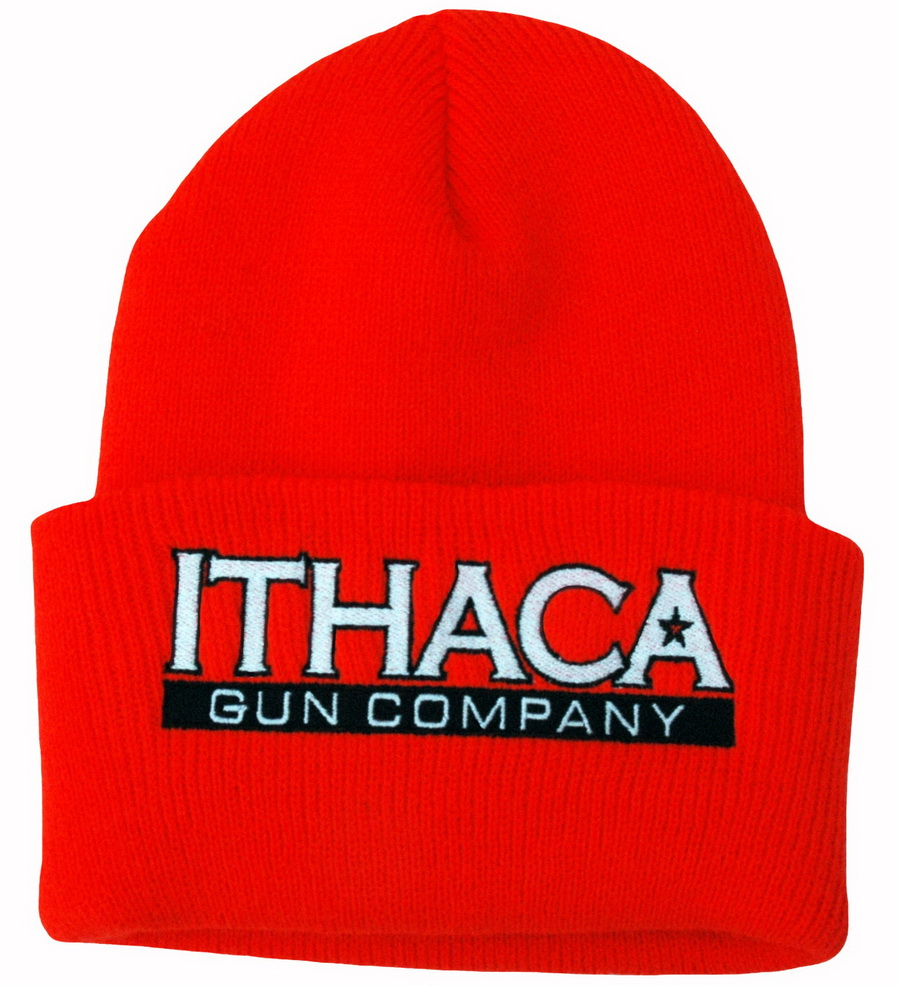 American made Orange Knit Beanie Cap with Cuff & Modern Ithaca Gun Logo.