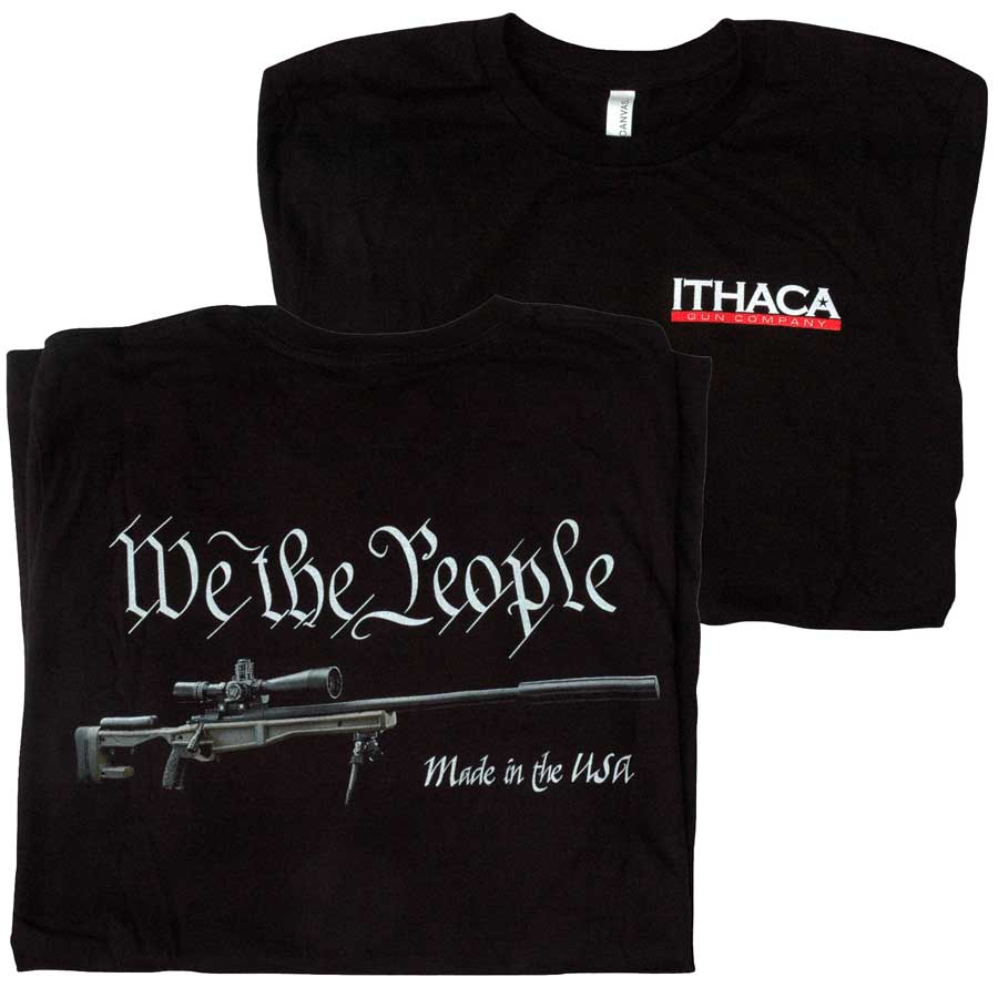 Black Rifle T-Shirt, 100% Cotton with Modern Ithaca Gun Logo on chest & Ithaca rifle graphic on back with “We The People” & “Made in USA” tagline.